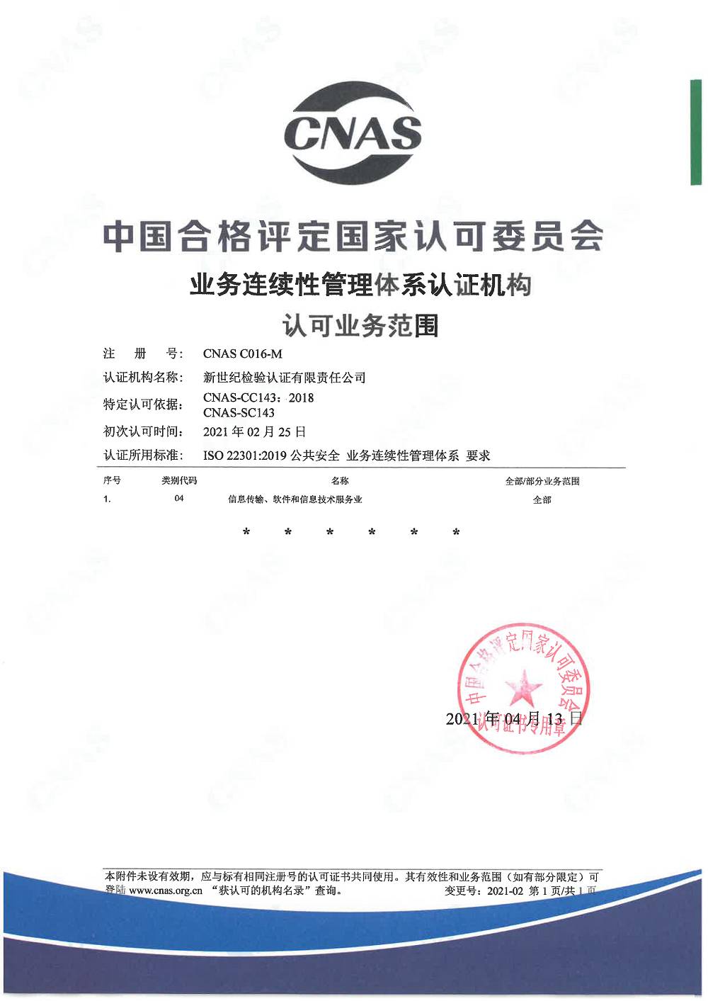 業(yè)務連續(xù)性管理體系認證機構認可證書