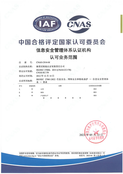 信息安全管理體系認證機構認可證書