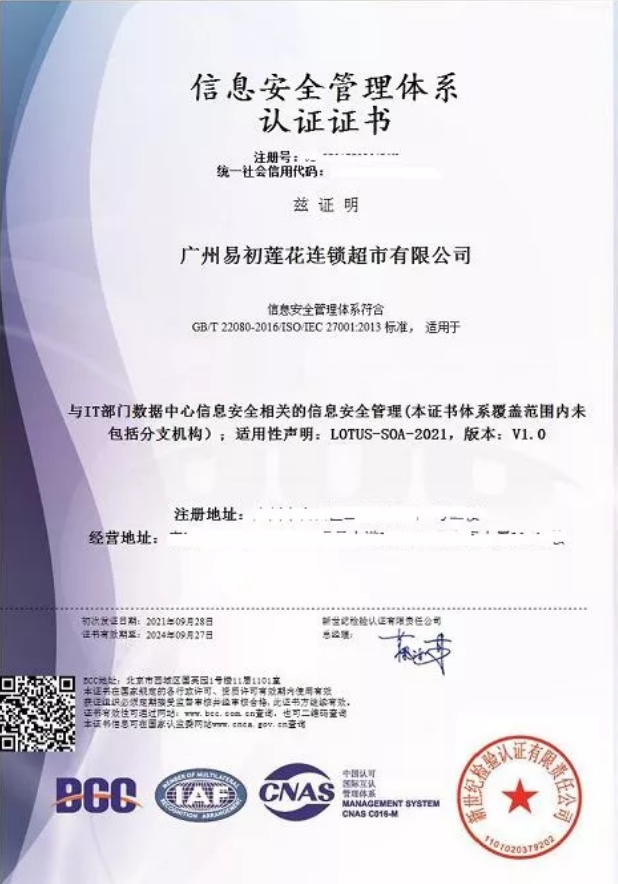 本次獲得BCC頒發(fā)的信息安全管理體系認證證書,標志著廣州易初蓮花在識別信息安全風險,減少可能存在的信息安全隱患,提升員工信息安全意識,實現(xiàn)良性發(fā)展方面又邁進一步!